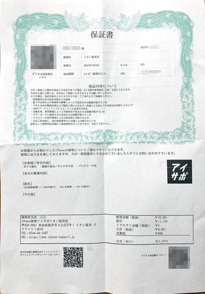 保証サービスは有り難いと思いました。十分安くて丁寧でサービスは行き届いていると思いますが、強いて言うとiPhoneのガラスの交換をした際に、保護フィルムも新しくする必要があるため、保護フイルムの販売と、貼ってくれるサービスがあると嬉しいと思いました。