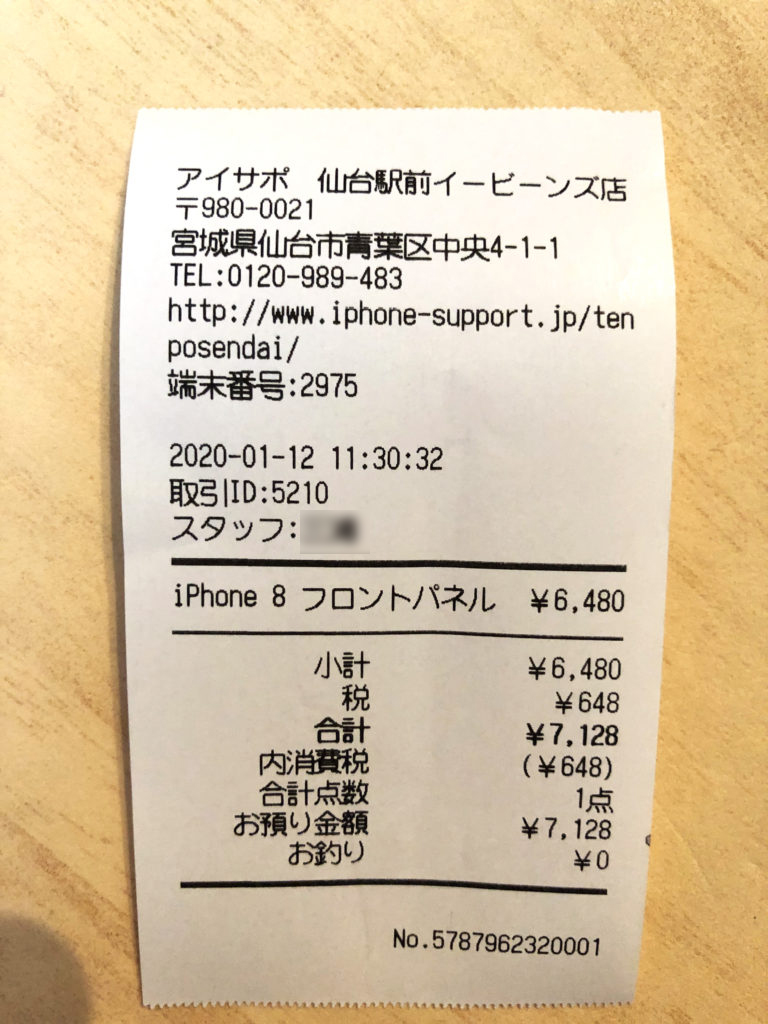 修理にかかった時間は1時間程度で、フロントパネルのみの交換でした。見た目や状態などは落として破損する前と変わらず、安価なフロントパネルは色などが以前より変わって見えると説明を受けましたが、全く遜色なく使えています。