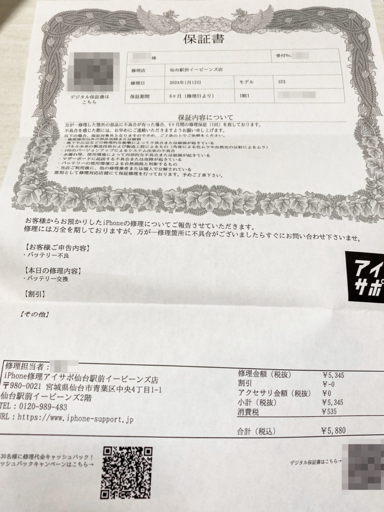 2年前に購入したiPhoneのバッテリーが長年使用による経年劣化で、修理が必要な状態(修理をお願いしたタイミングでバッテリー残量77%に)になってしまったので、バッテリーの交換をお願いしに行きました。