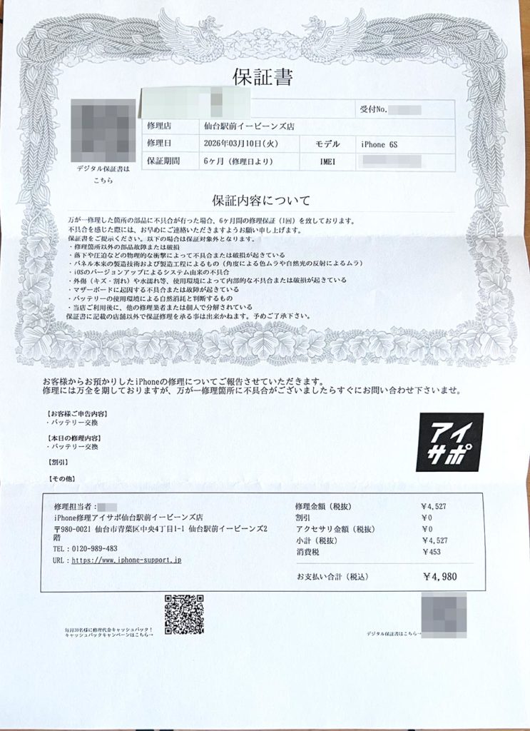 その後、症状を相談した時も完全に治らない場合があること、また治った場合も不具合がある場合の保証がある説明もしっかり話してもらいました。その上でもよろしければ承ります、とおっしゃっていただけて頼もしく感じました。修理も目安の時間通りに終わりましたし、修理交換後のチェックや説明も丁寧でした。家族や知人の携帯に不具合が起きたらオススメしたいと思います。