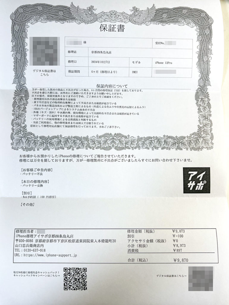 接客対応は非常に良いと感じた。店員さんの印象もとても良いと思う。以前に他の店でiPhoneのバッテリー交換をしてもらったが、そこは店員の対応が悪すぎた。それに比べるとアイサポの顧客対応は非常に良いと感じた。