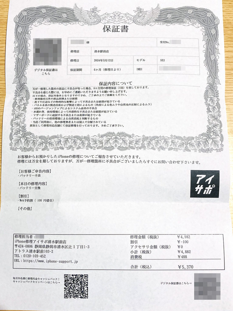 価格が安いためお勧めできる。また事前の動作確認、修理後の動作確認を客の前で実践するため、信頼が持てる。さらに6ヶ月保証があるため、万が一不具合がでても安心できるとおもう。バッテリーを交換したからと言って新品同様とならないことやアプリのメモリ量が増えていることからのバッテリー消費が大きくなっていることなど教えてもらい勉強になった。