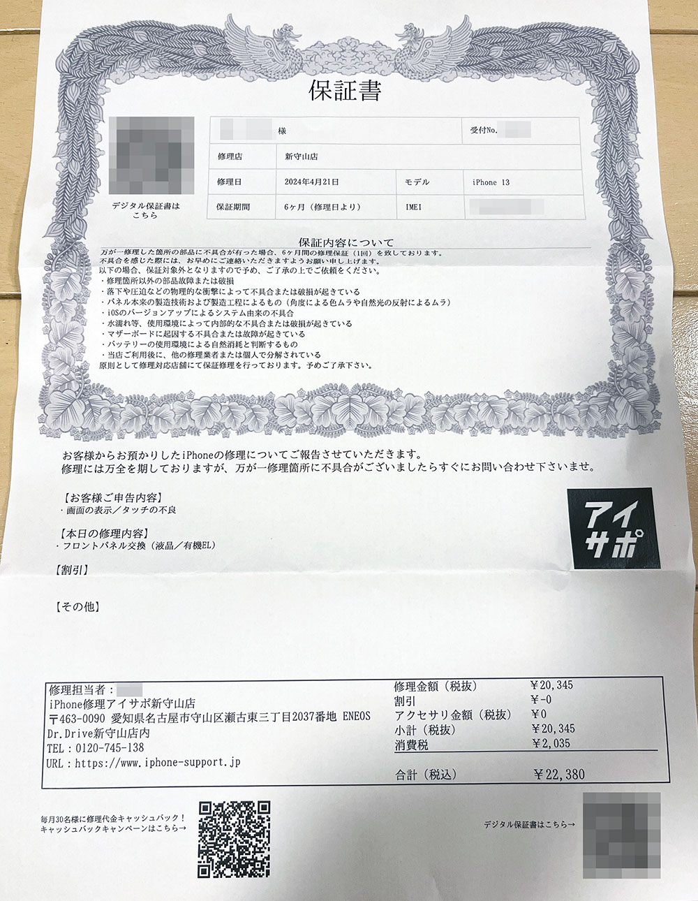 まず、正規店に連絡したら10万ぐらいかかると言われ躊躇して、イオンに入っている店舗で30,000円ぐらいと言われましたがiPhone13の在庫切れで待つと言われネットで探して連絡をしたら1番安く、すぐに対応してくれました。