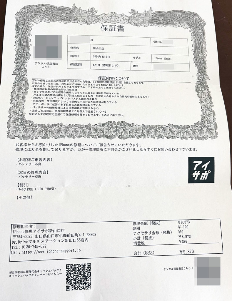 再修理6ヶ月無料はありがたい。次回から5%安くなる券をもらえたが、アプリかスマホのサイトなどで登録できるようになれば次回から記入事項も減って楽に済ませられると思う。