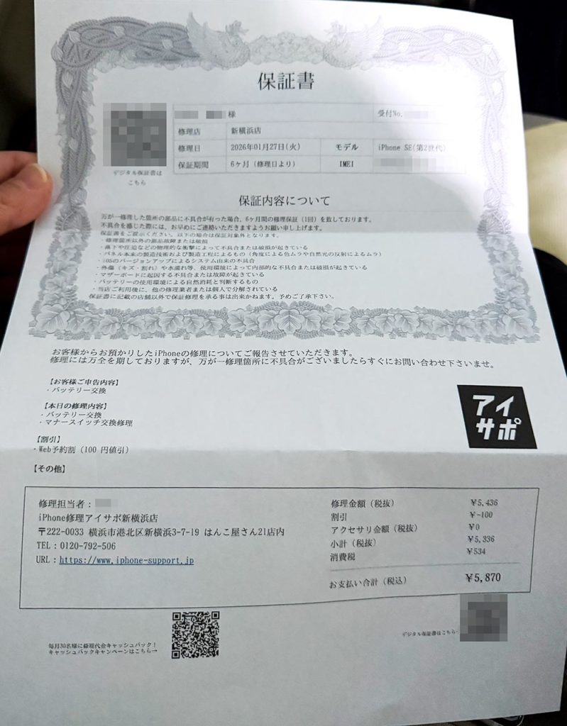 駅近ということ、予約の取りやすさ、近隣には時間を潰す場所もあるのでよい店舗選択ができたと思う。不具合があったらすぐに持ち込むことで、長く機種を使い続けられると思われる。不具合があった際、その不具合の項目、修理項目が明示されているので、さまざまなトラブルには気付きやすくなる気もしている。壊れたものを壊れてまま使うことのデメリットについても説明してもらえたので親切だと感じた。以上の点からこちらはオススメできる。