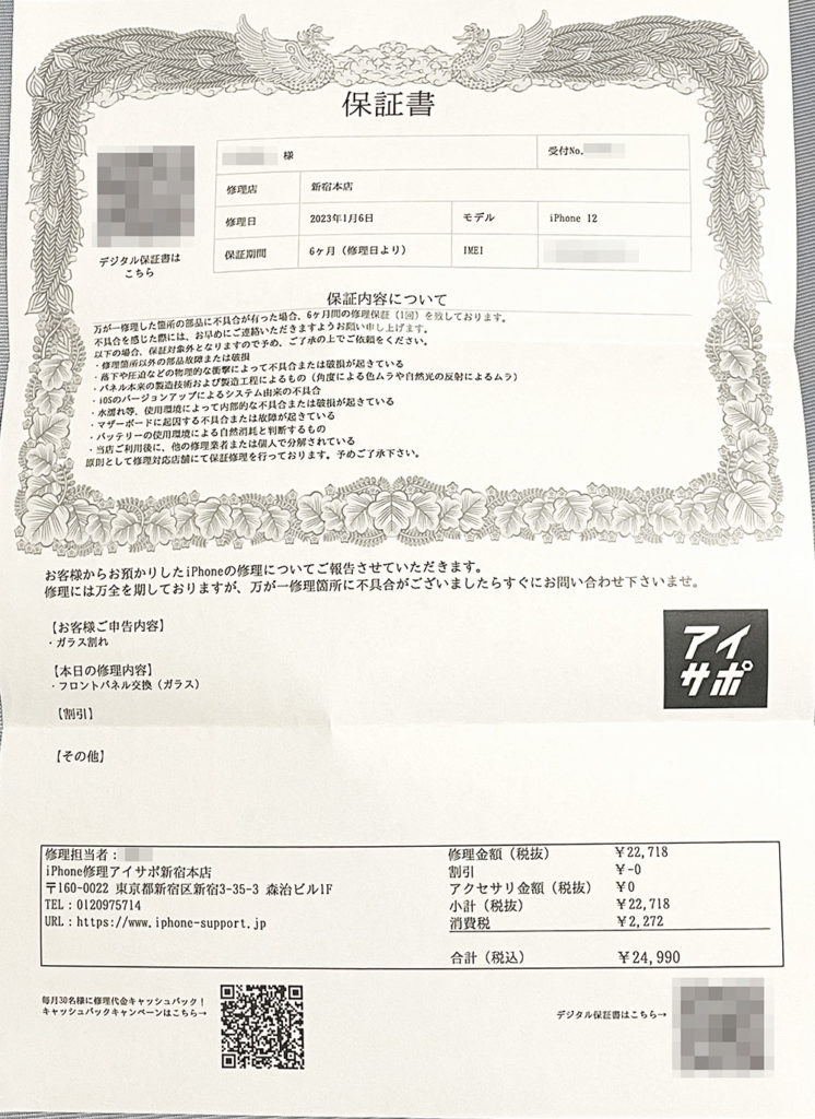 修理サービスの品質は、iPhone12の安い方のパネルを選択しましたが、現状では特に問題なく使用できています。修理時間については一時間後に引き渡しということでしたので、55分後くらいに受け取りに行ったら終了していたので満足です。