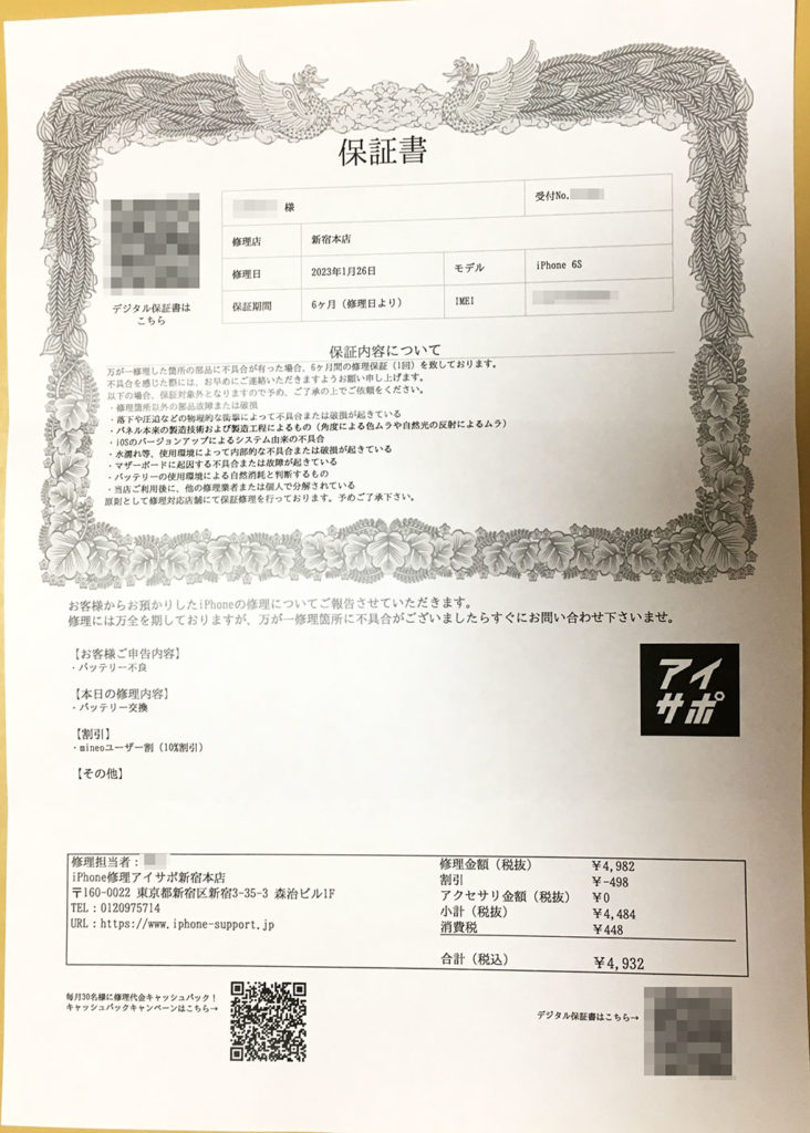 修理のお店をネットで調べ、十分安いと思いました。また、マイネオ契約者割引もできたのが、自分にとってはありがたかったです。