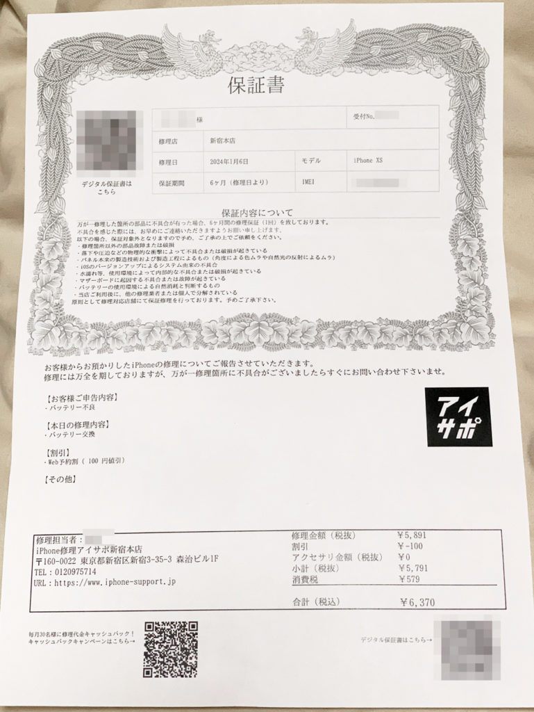 6ヶ月と長めの保証サービスは安心感があります。他店の修理サービスと比較した時にお値段が安いことに加え、アイサポを選択する一つの理由かなと思います。スマホを預けると時間を確認することができないので、当日中に修理が完了する場合は、腕時計などを借りられるサービスがあると良いなと思いました。
