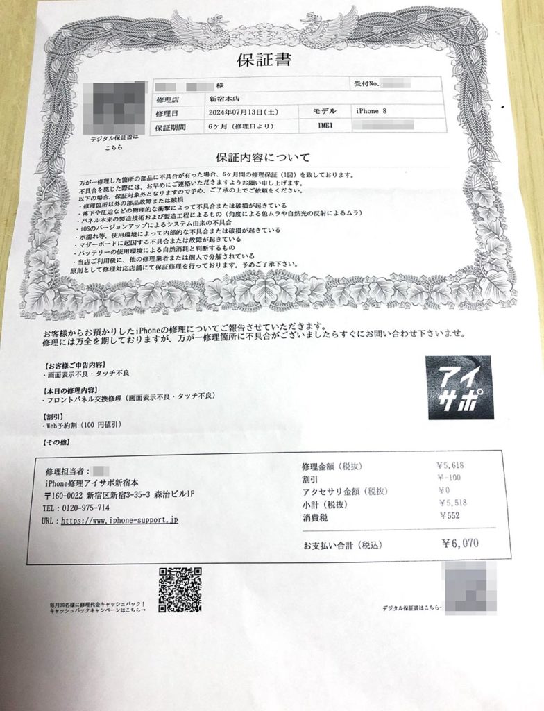 修理後には、店員の方が動作確認を行ってくれ、故障部分以外が今まで通り正常に動作することがすぐに分かった。自分で使ってみても修理前よりも画面が綺麗になったように感じ快適になった。時間も迅速に丁寧に対応してくれ、品質はよいと感じた。