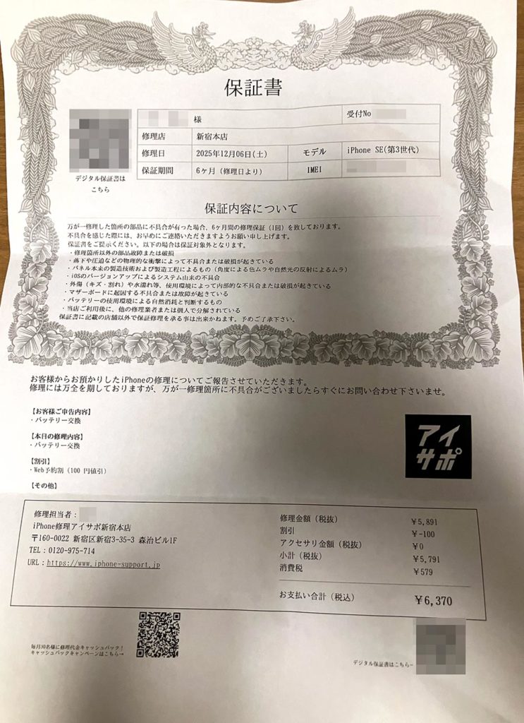 使用頻度が高く、新品で購入してから2年程度バッテリーの持ちが悪くなってきたので、その修理(交換作業)をお願いしました。パーセンテージとしては新品と比較して85%程度だったので、交換タイミングとしては少し早い旨を伺いました。修理店としてのご意見を正直に言ってくれたのは交換が持てました。