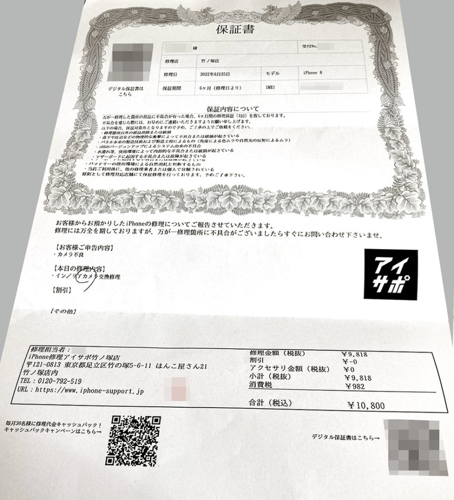 修理後の保証:半年間の無料保証がついているので、再発不具合などがあった際にも安心。
