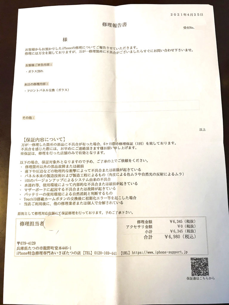 今回はフロントパネルのひび割れの修理、交換なので保証期間での再修理は多分使わないと思いますが安心です。これからはバッテリー交換とかで来店すると思います。