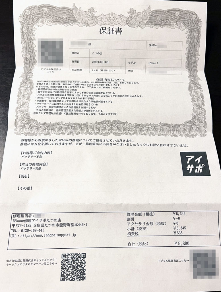 修理後のiPhoneの状態はとても良く、バッテリーの持ちも良くなりました。修理に40分ぐらいかかると案内されていましたが、iPhoneの状態がキレイだったため20分程度で修理完了しました、と説明を受けました。