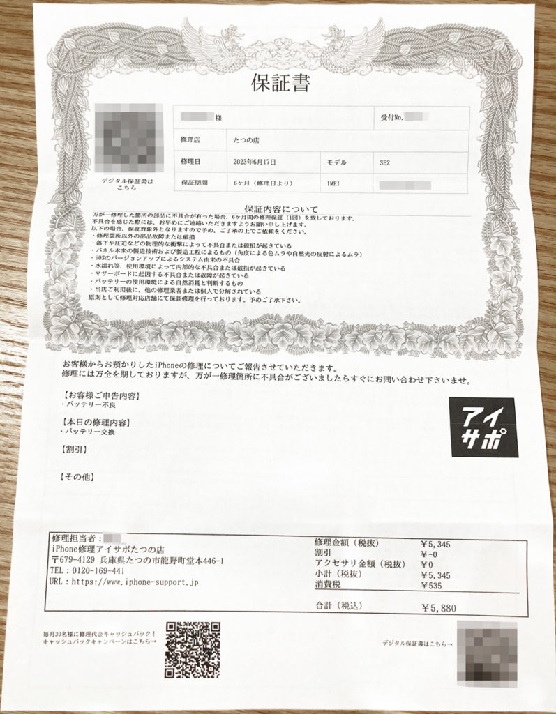 購入から2年以上が経ち、そのせいかバッテリーの持ちが悪くなり、半日も持たないようになってきていて、度々充電も出来ないですし、日常生活にも支障が出ていたのでお値段も安めだったのでバッテリー交換をお願いしました。