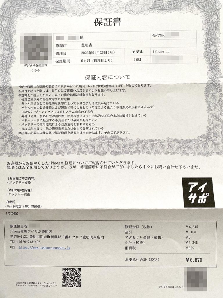 バッテリーの劣化によるものだと思います。このiPhone11を購入して使い続けて6年目になります。バッテリーの容量が70%台まで落ち込んでいました。フル充電を日あたり2回しないといけない状況でした。修理内容はバッテリー交換です。