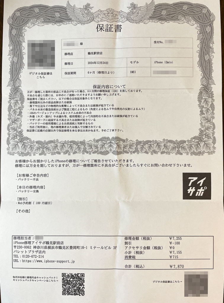 修理内容はiPhone12 miniのバッテリーの最大容量が80%以下になってしまったためバッテリーの交換をしたいと思って交換いたしました。その他の修理はしておらず、バッテリー交換のみを行いました。