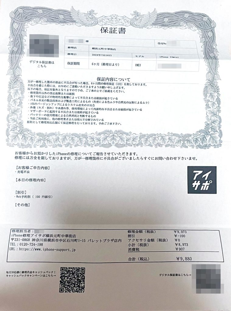 6ヶ月間の保証サービスということで、修理後の数日間は調子が良かったがその後不調になった場合でもかなり長期で修理対象となるので安心しました。欲を言うとスタンプカードがあれば嬉しいと思いました。